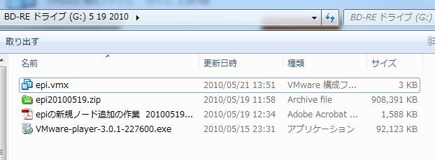 このDVDにおいてあるepi.vmxをさっき展開したフォルダepi20100519にドラッグします.つまりコピーして上書きします.epi20100519.zipを作成したあとにepi.vmxに修正が必要になってしまったので,このようになっています.