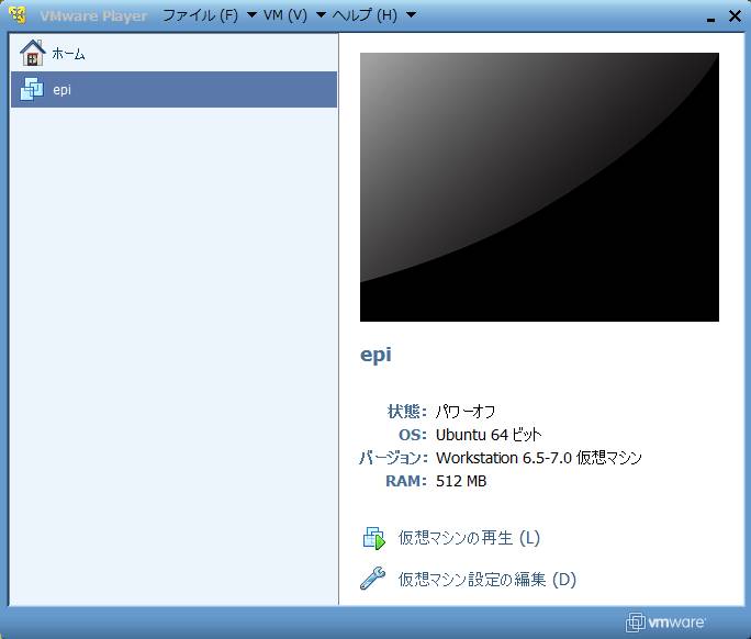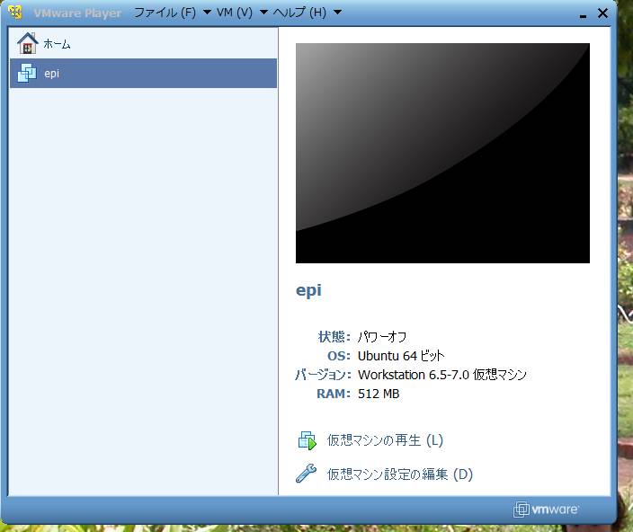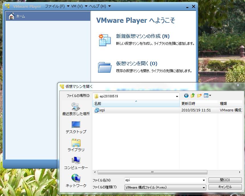 ここまでできたらvmplayerを起動して,「仮想マシンを開く」をクリックして、さっきのepi.vmxを開いてください.(下の図ではepiとだけみえています)