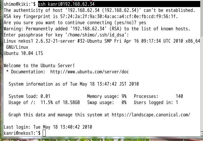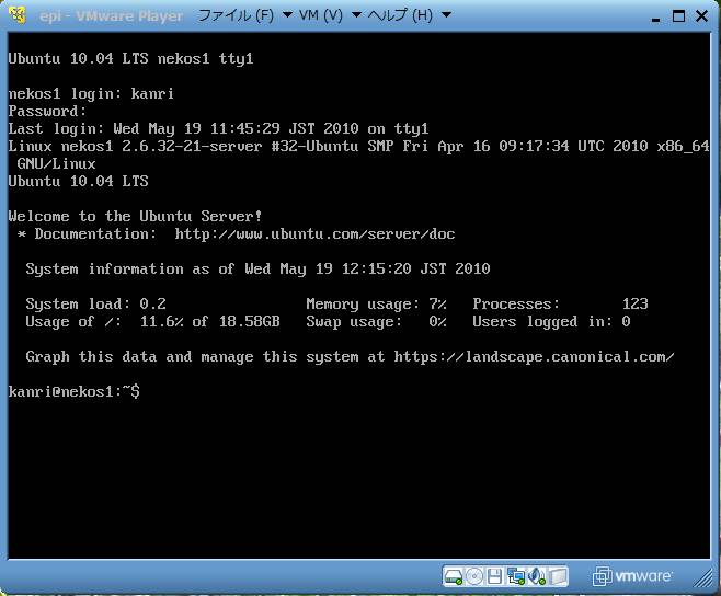kanri@192.168.62.34 としてさっきの仮想PCへリモートログインする.もしくは、ユーザーの机のところへ行ってvmplayerのコンソールから直接作業してもかまいません。わたしは自分のssh公開鍵をkanriアカウントの.ssh/authorized_keysにおいてあるので、sshでパスフレーズ入力してログインしてます。通常のパスワードでログインもできます。