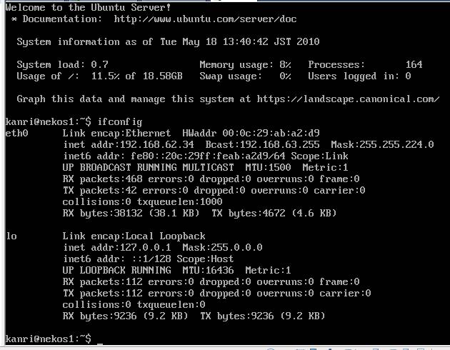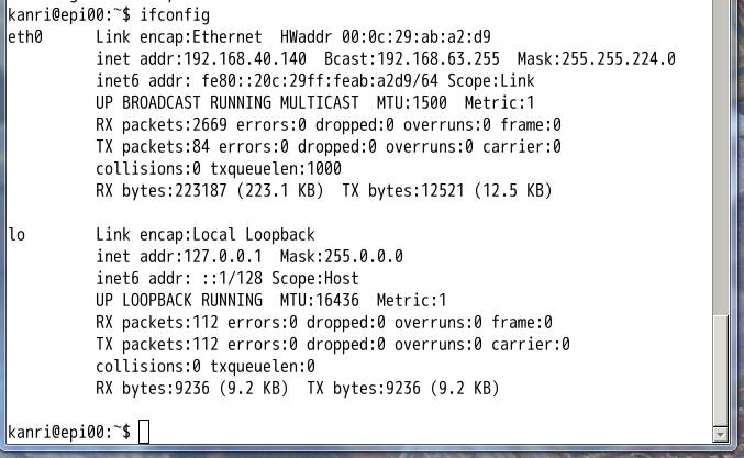 ふたたびkanriでログインする.そしてifconfigとうつ.