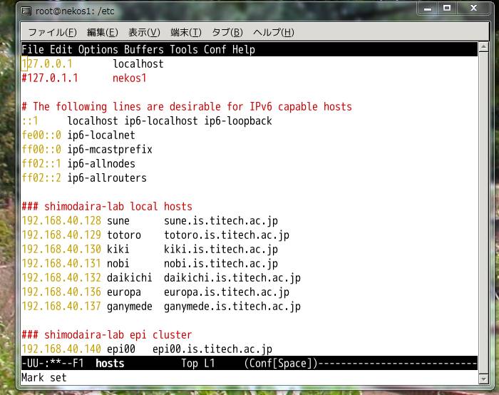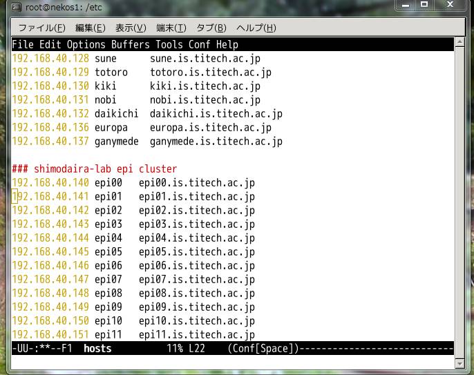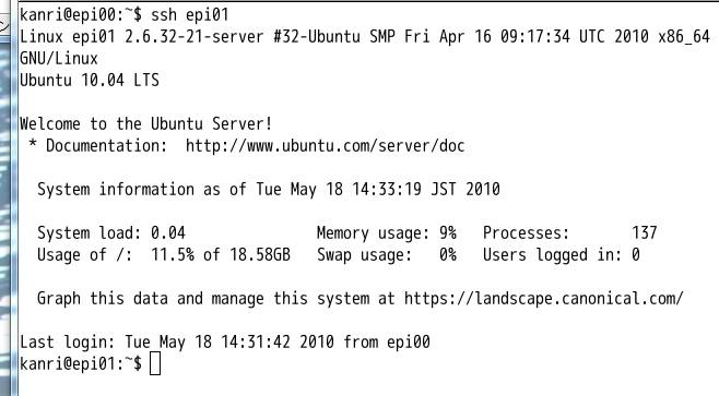 管理者が実行する作業が終わると次のような状態になります。ここではepi00ですが、たとえばepi05のように違ったホスト名になっているはずです。
