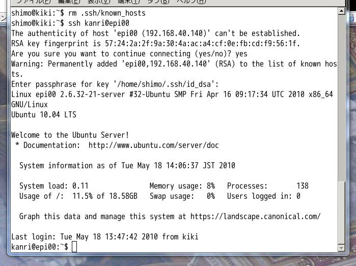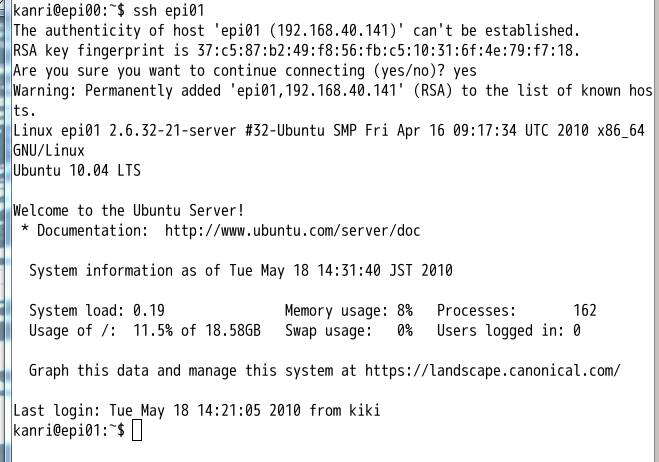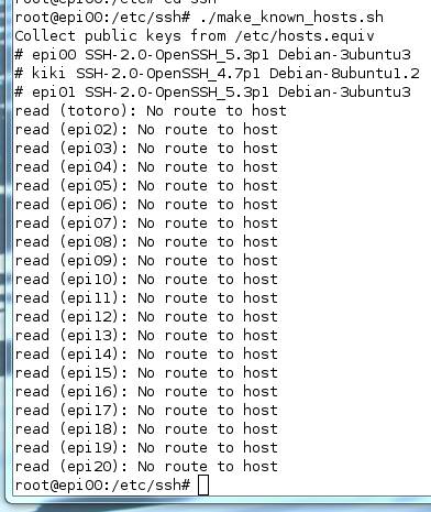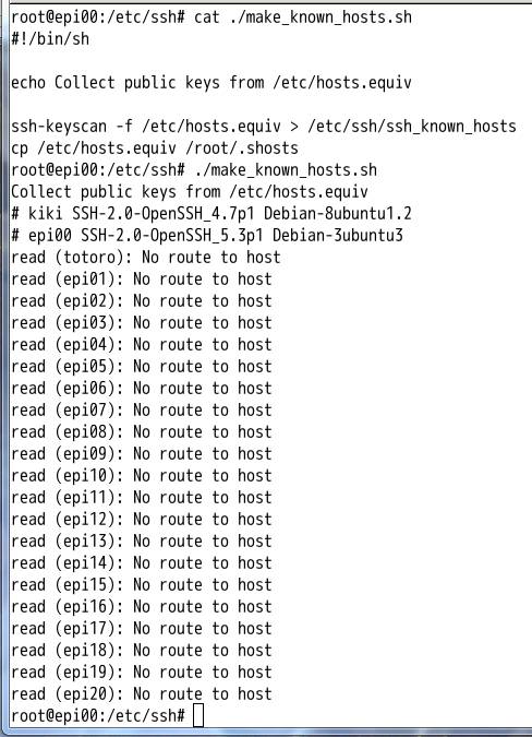 新しいPCを追加するたびに,すべてのPCでmake_known_hosts.shは実行するか,epi00等からssh_known_hostsファイルを転送してやる必要がある.後ほどepi01,