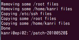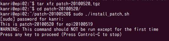 つぎにパッチをあてます.epi20100519.zipをDVDに焼いた後に,いろいろ細かい修正が必要になってしまったからです.ここだけ該当ノードのホスト名をepi00ではなく,epi02とします.