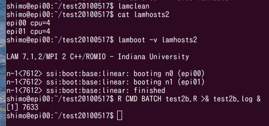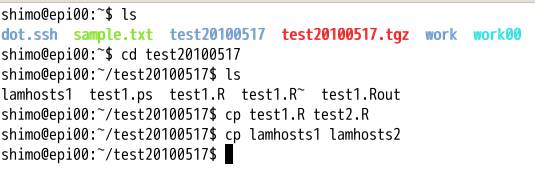 展開してできたディレクトリtest20100517に移動します.test1.Rとlamhosts1を