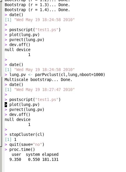 うえをみると,epi00で4個,epi01で4個のcpuが確保できたのがわかります.はじめはcpuを1個だけつかってpvclust(反復数=10)を実行です.時間をみると,9秒くらいですね.