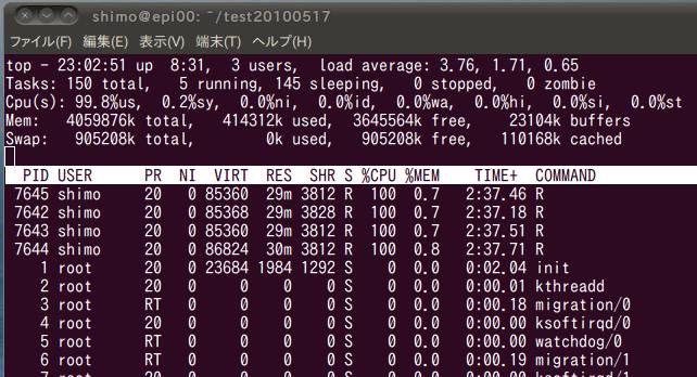 topとするとepi00での状況がわかります.load averageの時間平均(過去何分間かの平均値)がだんだん4にちかずきます.qで終了.